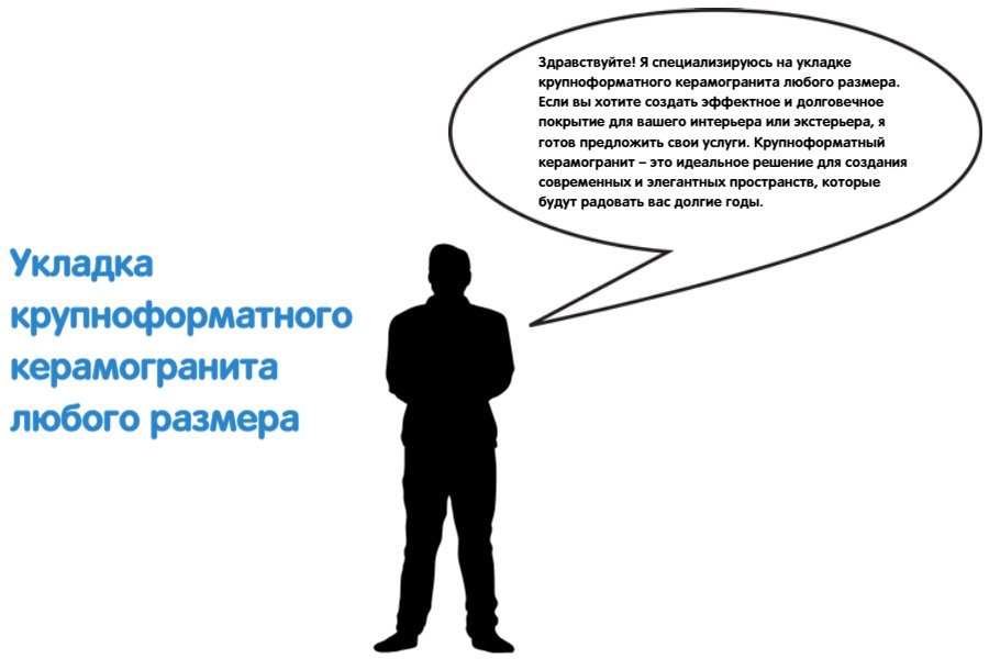 - Консультация и проектирование На начальном этапе мы обсудим ваши пожелания и требования к укладке крупноформатного керамогранита. Я помогу вам выбрать подходящий формат плитки, цвет и текстуру, а также разработаю план укладки, учитывая особенности вашего пространства.